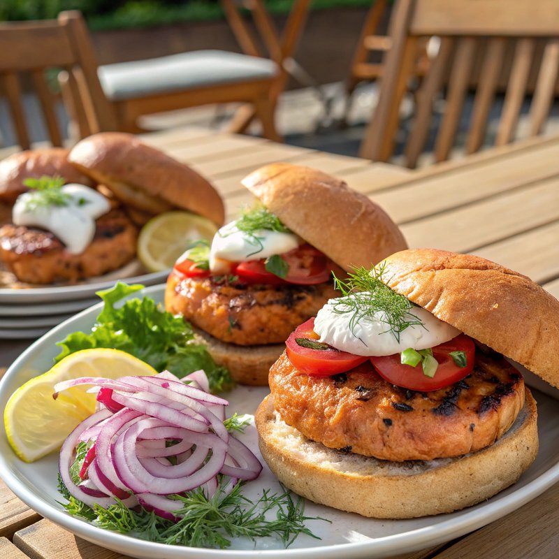 Indulge in these gourmet salmon burgers, a delightful twist on the classic dish! Made with fresh salmon fillets, these burgers are packed with flavor from zesty lemon, aromatic dill, and a punch of garlic. Perfectly seared to golden perfection, they sit between soft, toasted buns, topped with crisp lettuce, juicy tomatoes, and sharp red onions. Ideal for a summer barbecue or a quick weeknight meal, these salmon burgers are not just delicious but also a healthier alternative to traditional beef burgers. Dive into this savory experience that marries the heartiness of a burger with the fresh taste of the sea!