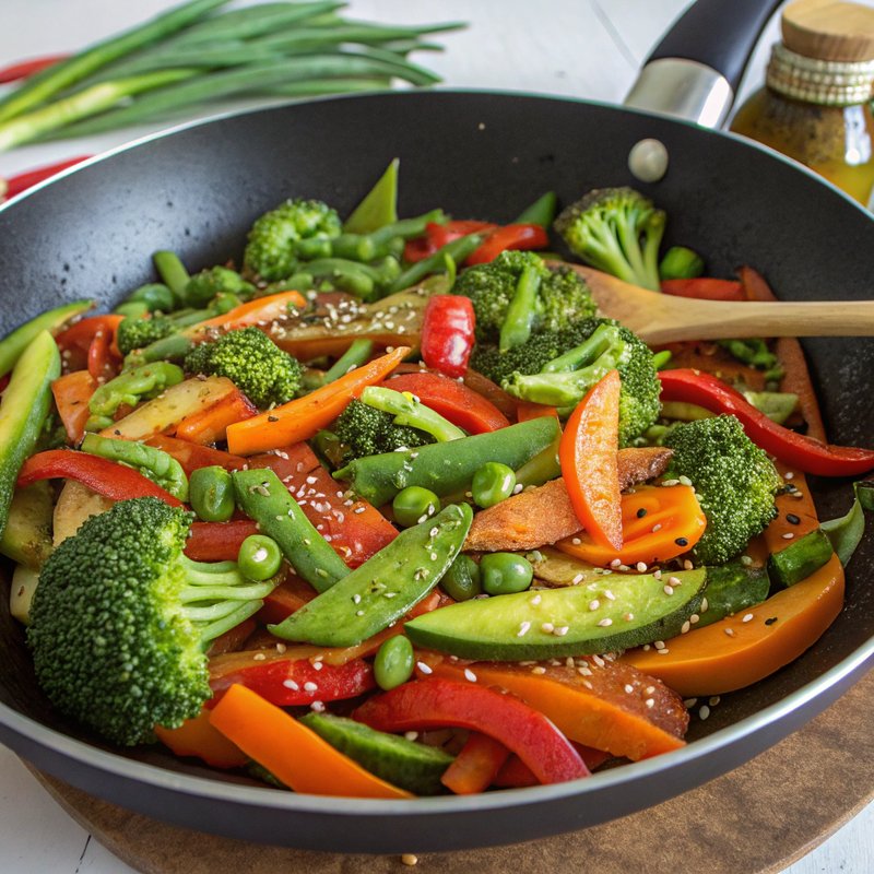- Introduce the sliced red bell pepper, broccoli florets, julienned carrots, and snap peas to the skillet. Stir fry for 3-4 minutes until the vegetables are vibrant and just tender.